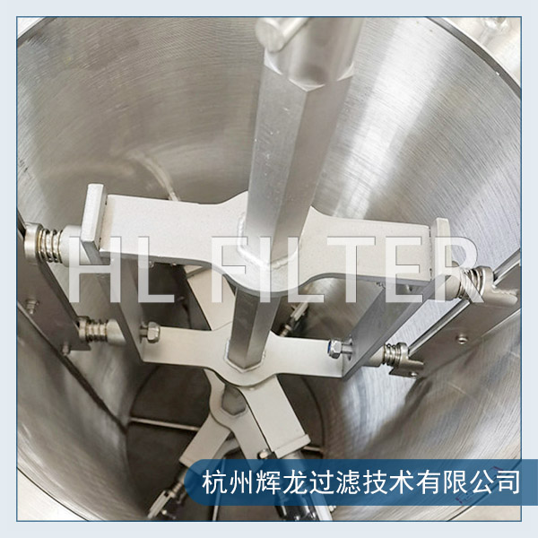刮刀過濾器過濾狀態:液體從進口流入,內部掛刀緊貼濾元內表面,液體從濾元內表面向外過濾,雜質被截留在濾元內,液體從出口流出,隨著時間的推移,雜質逐漸增多,壓差上升,按設置壓差進行清洗排污