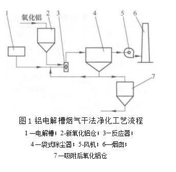 其煙氣干法凈化工藝流程:各電解槽的煙氣匯集在一起進入反應器,同時定量加入新鮮氧化鋁,然后進入袋式除塵器.