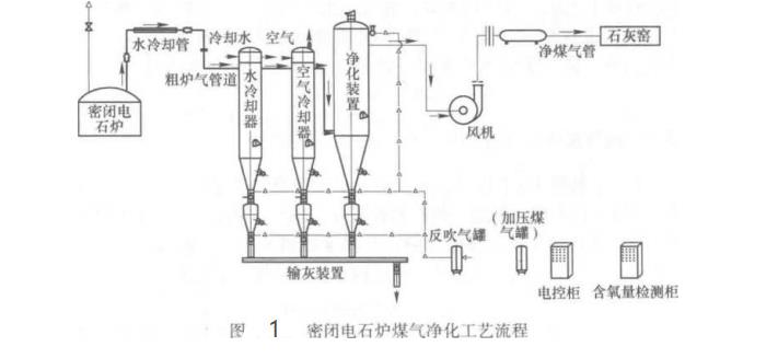 密閉電石爐生產煤氣凈化工藝流程是:荒煤氣先經水冷管道冷卻,再經粉塵,焦油沉降器,約50%的粉塵在此除去,再依次通達空氣冷卻器捕集焦油冷卻器將煙氣溫度降至220?250℃,然后進入袋式除塵器.