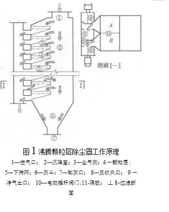 沸騰顆粒層除塵器工作原理含塵氣體從除塵器頂部進入在沉降室使粗粒粉塵分離而落入灰斗細粒粉塵隨同氣流經塵氣側自上而下穿過顆粒層粉塵被捕集凈氣由出口排往大氣.