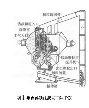 垂直移動床顆粒層除塵器工作時,含塵氣體從塵氣入口進入沉降室除去粗粉塵,繼而穿過垂直移動的顆粒層使其攜帶的細粉塵被捕集.