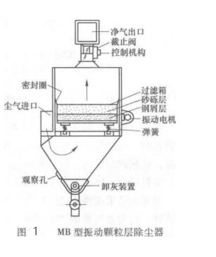 機械振動顆粒層除塵器由多個并聯的除塵單元組成,顆粒層設于彈簧支架上,側面裝有逆向轉動的振動電機.