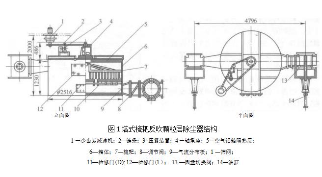 塔式梳耙反吹顆粒層除塵器系我國于20世紀70年代研制.該除塵器有8個過濾單元,分別沿豎向布置在兩座塔架上.
