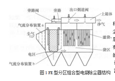 電袋復合主要有兩種形式:一體組合型電袋復合除塵器.分區組合型電袋復合除塵器.一體組合型電袋復合除塵器的顯著特點是.將電除塵器的極板.極線同袋式除塵器的濾袋較緊密地組合在一起.
