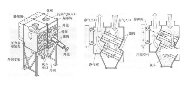 濾筒式除塵器的突出特點是不釆用常規濾袋,而是褶疊濾筒.在除塵器外形尺寸相同的前提下使過濾面積大幅度增加,從而顯著縮小除塵器的體積,降低鋼耗.