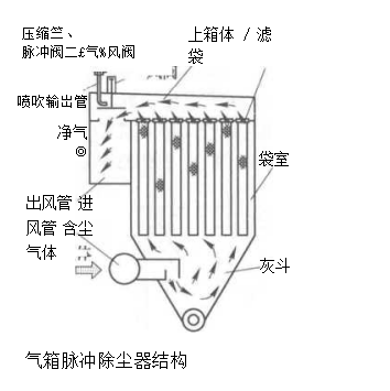 氣箱脈沖袋式除塵器包括上箱體,袋室,灰斗,進出風口和氣路系統等.上箱體分隔成若干小室,每室的出口處設有停風閥(提升閥).