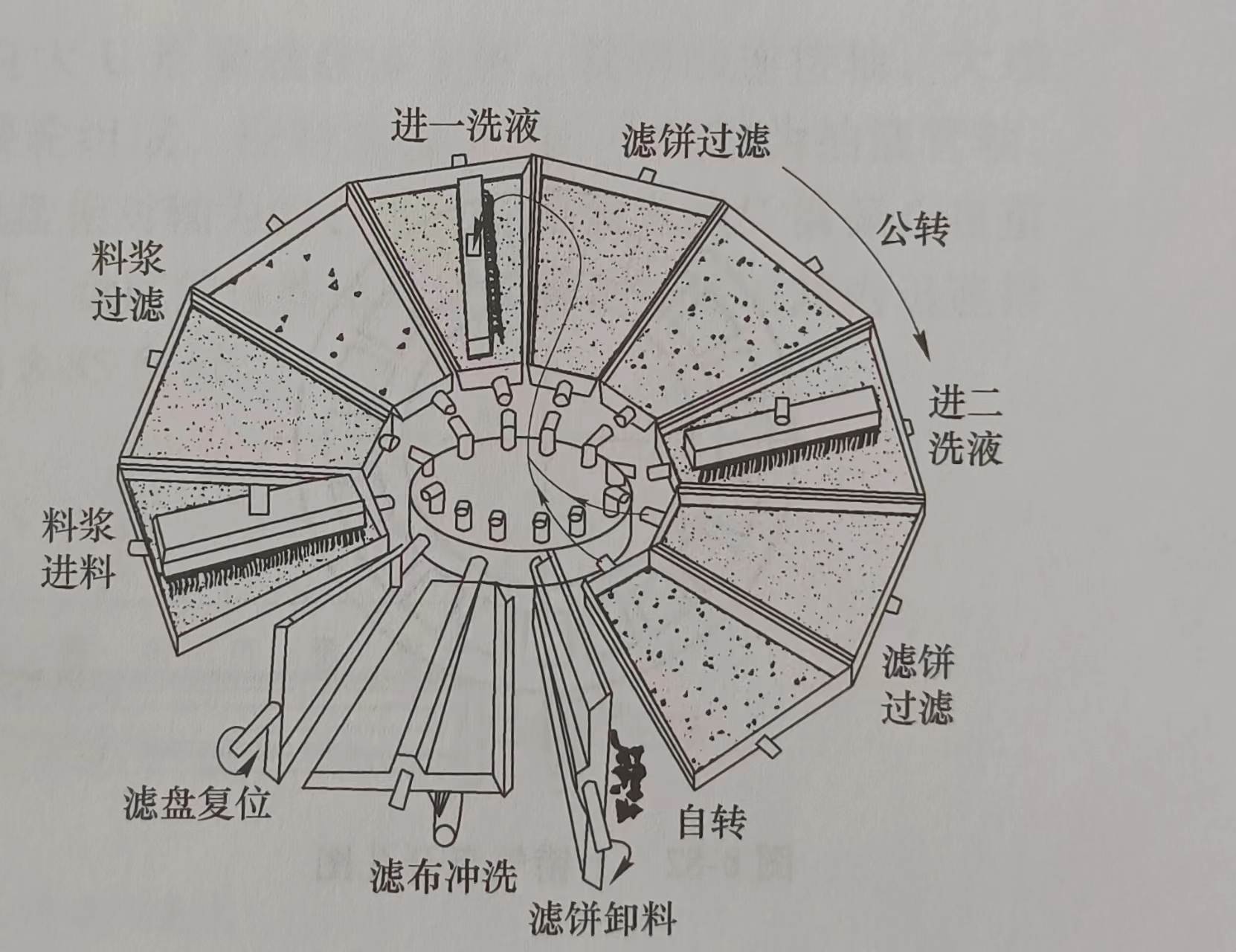 將翻盤真空過(guò)濾機(jī)展開(kāi)成平面圖形,通過(guò)展開(kāi)的平面原理圖可以更醒目地了解其工作原理:過(guò)濾機(jī)的每個(gè)濾盤小端部都通過(guò)吸酸膠管與中心分配頭的上錯(cuò)氣盤各孔——對(duì)應(yīng)相通,并與之同步水平回轉(zhuǎn)
