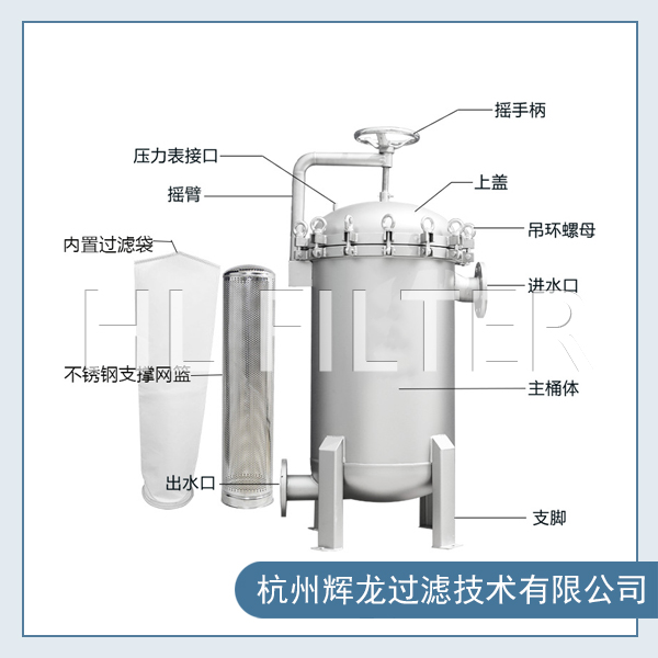 結(jié)構(gòu)設(shè)計:搖臂吊環(huán)快開袋式過濾器具有搖臂吊環(huán)結(jié)構(gòu),可以快速開啟和關(guān)閉濾袋,方便更換濾袋和維護設(shè)備。普通袋式過濾器通常采用螺栓或夾緊結(jié)構(gòu),更換濾袋時需要較長的時間和較多的操作步驟。